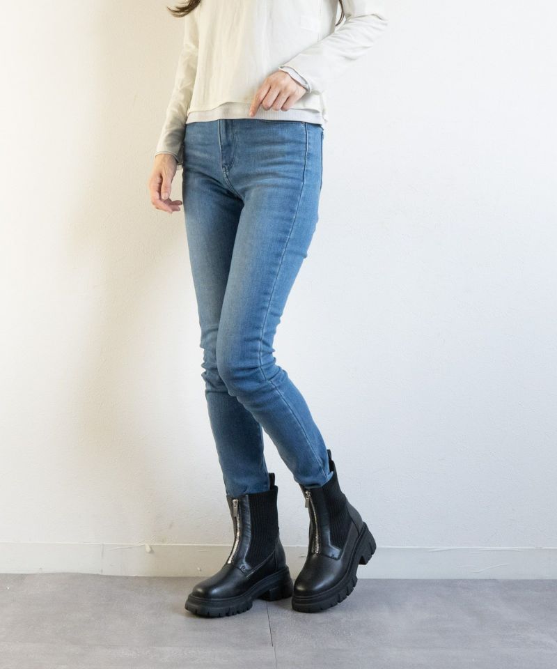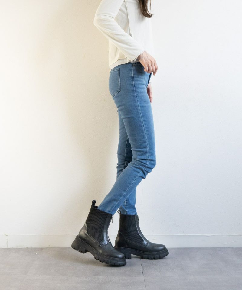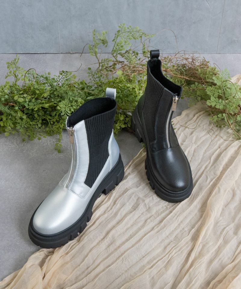 ショートブーツとサイドゴアのデザインが、都会的でスタイリッシュな印象を引き立てます。