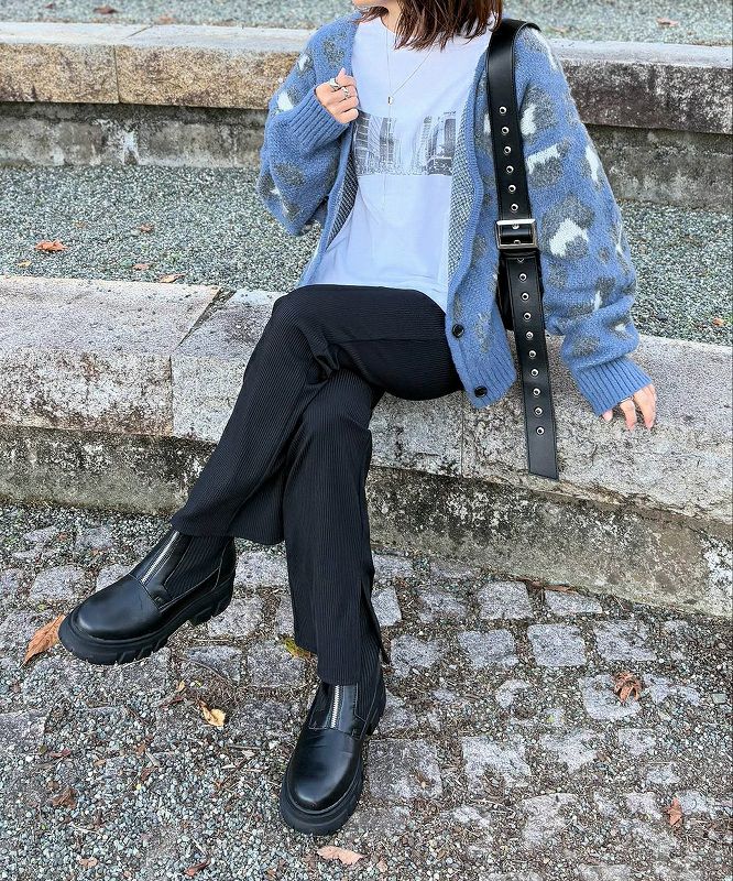 スタイリッシュさとショートブーツのエレガンスが、トレンド感のあるコーディネートを完成させます。
