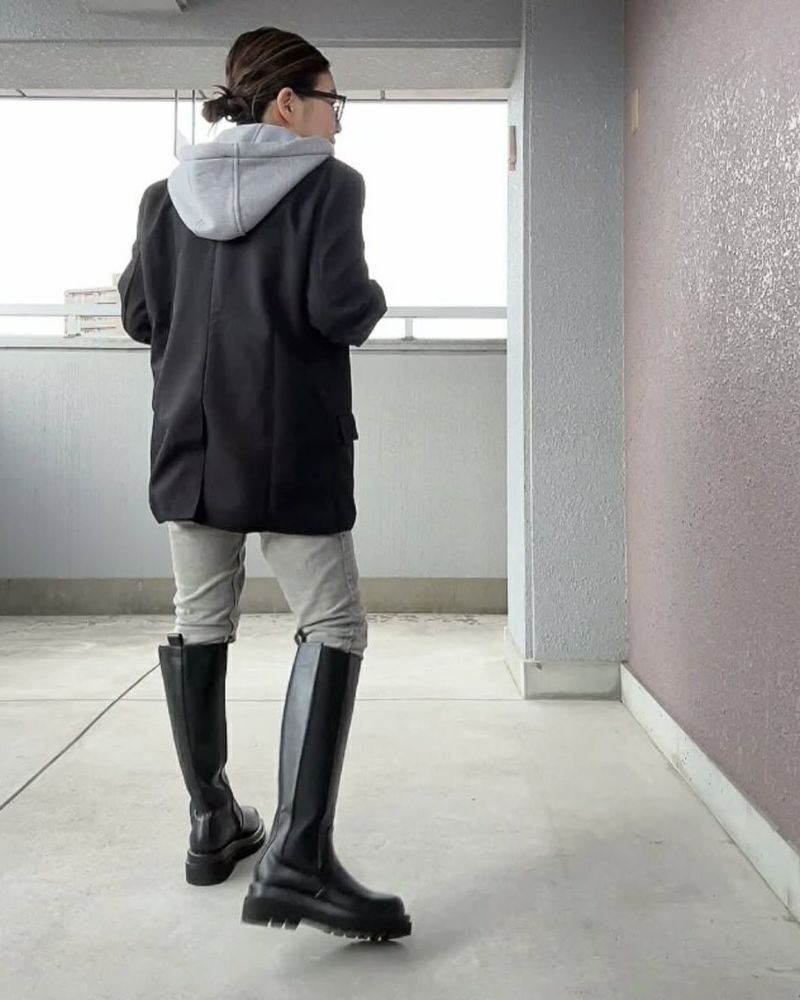 スキニーパンツに合わせてシャープに決めるのが定番。