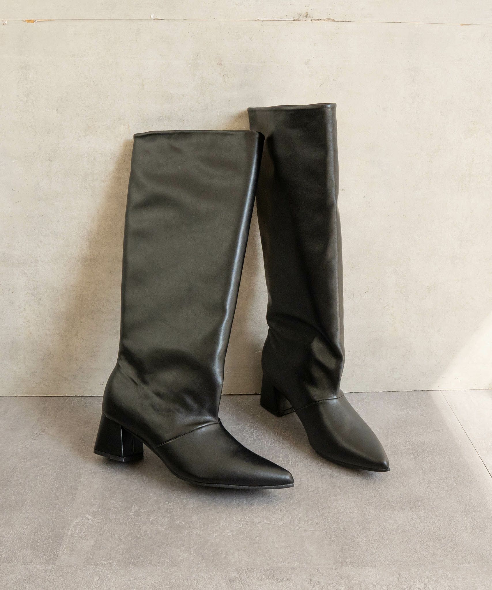 膝下までのロングブーツシルエットが、エレガントでありながらも暖かさを提供します。