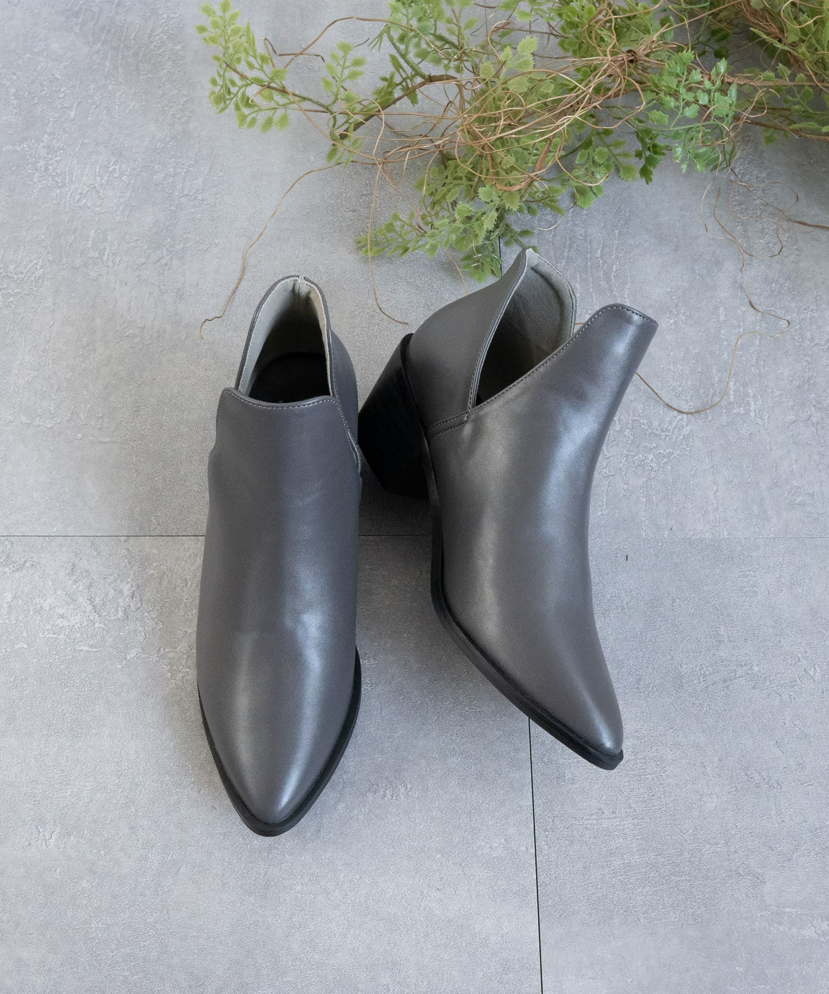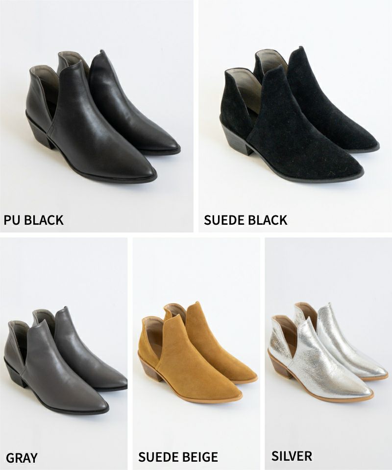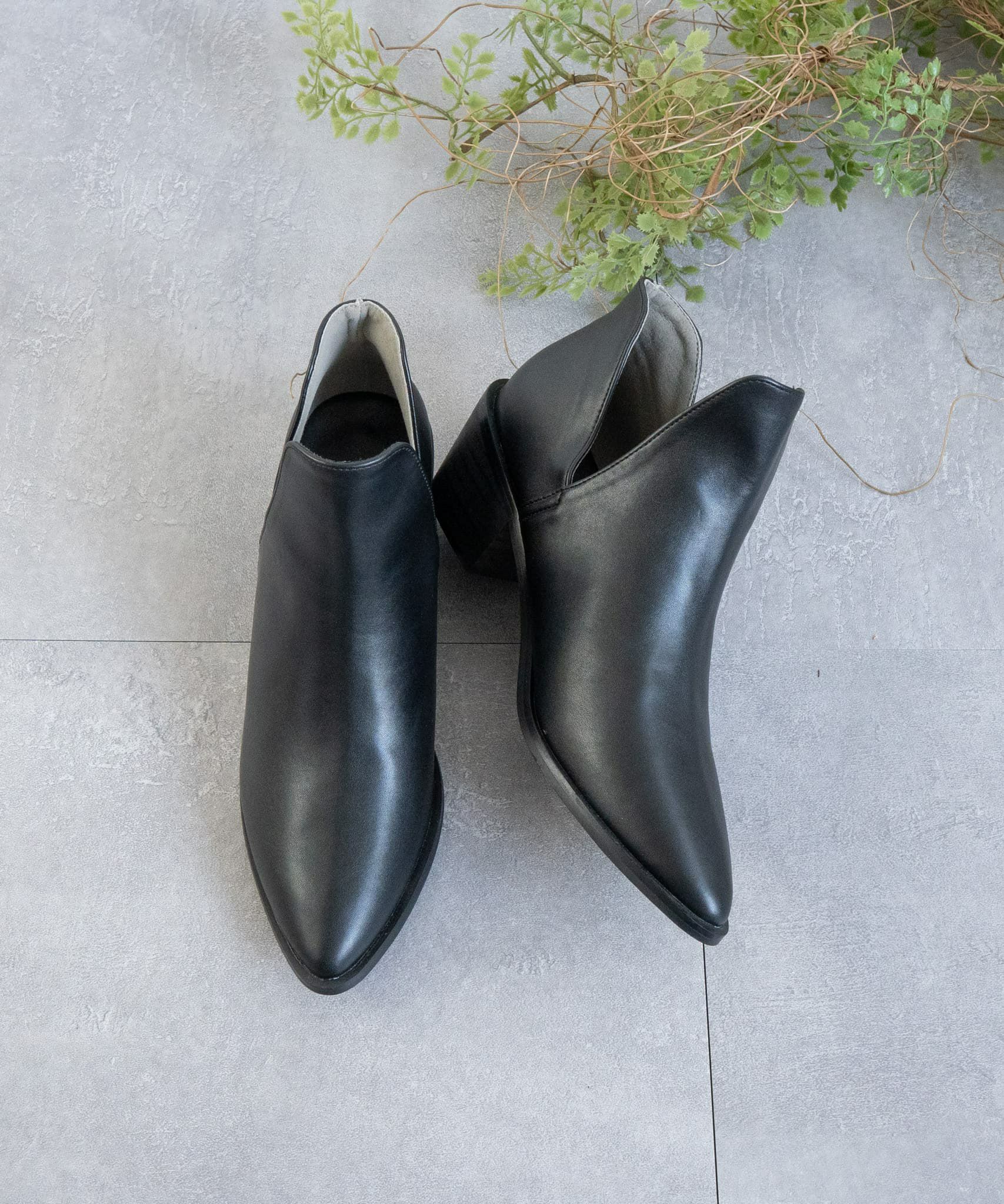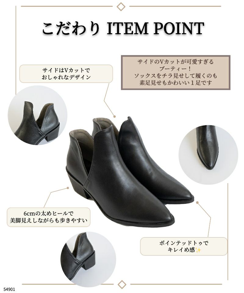 特のサイドVカットデザインと洗練されたシルエットが特徴で、さまざまなコーディネートに合わせやすいブーティーです。
