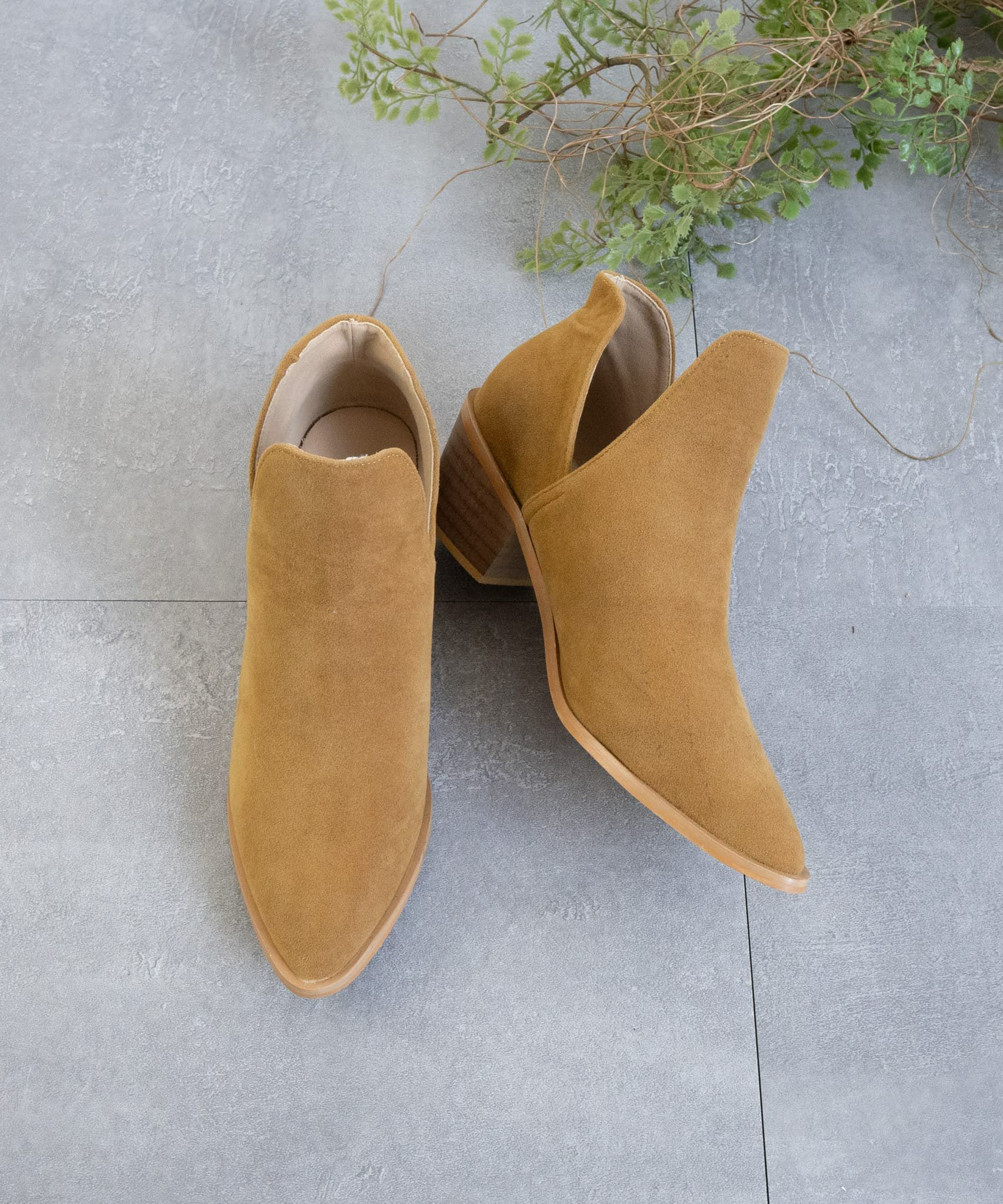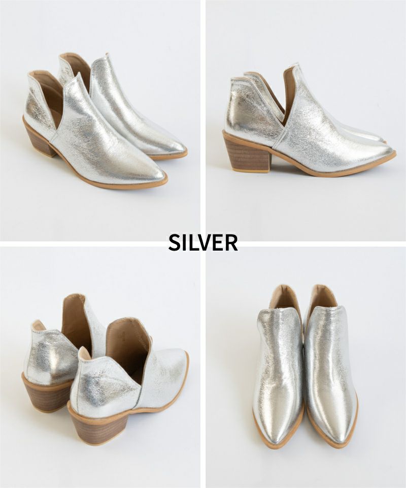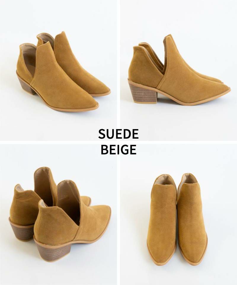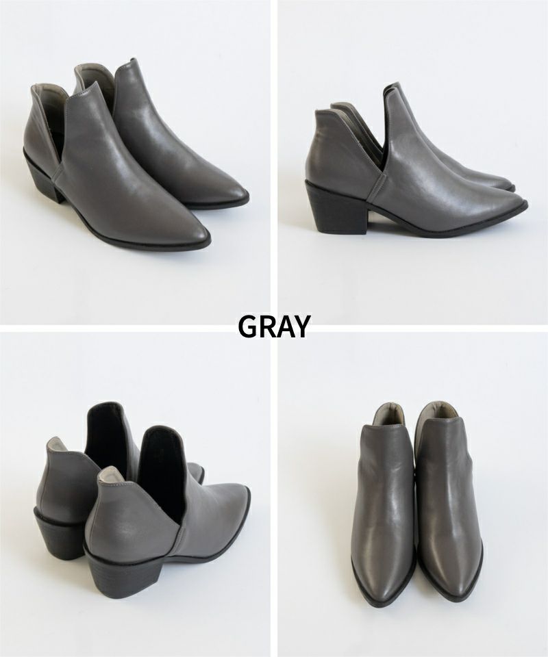 特のサイドVカットデザインと洗練されたシルエットが特徴で、さまざまなコーディネートに合わせやすいブーティーです。