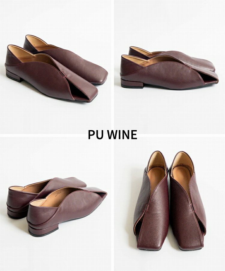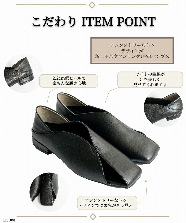 アシンメトリーなデザインとスクエアトゥが特徴のパンプス。