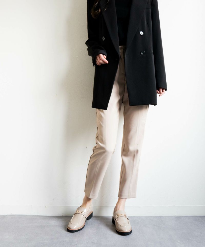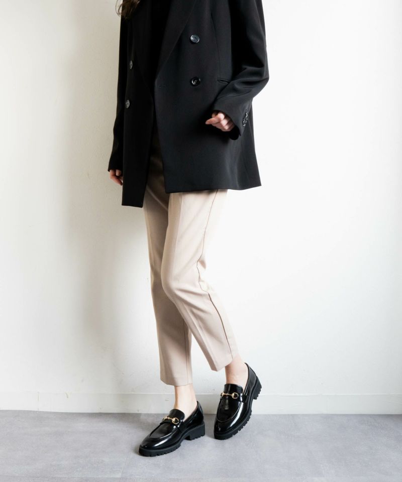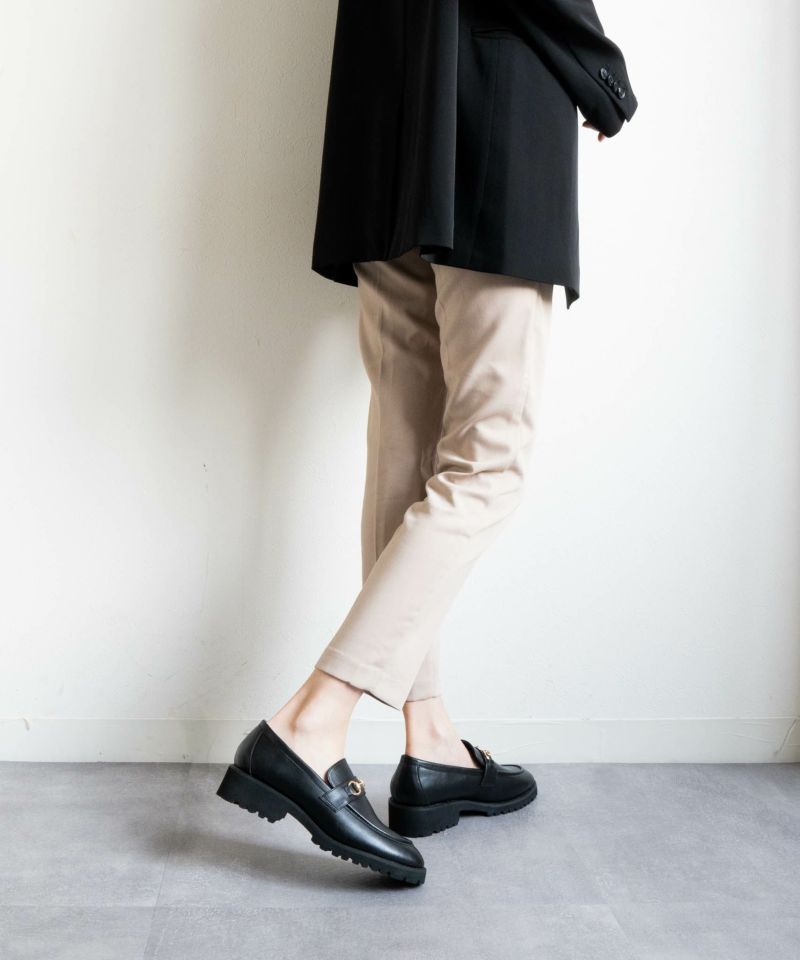 フラットなローファーと異なり、厚底がアクセントになり、シンプルなコーディネートを引き締めることができます。