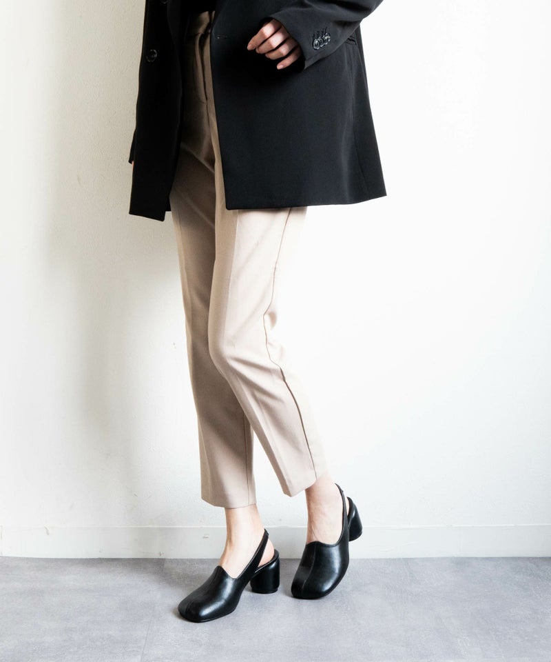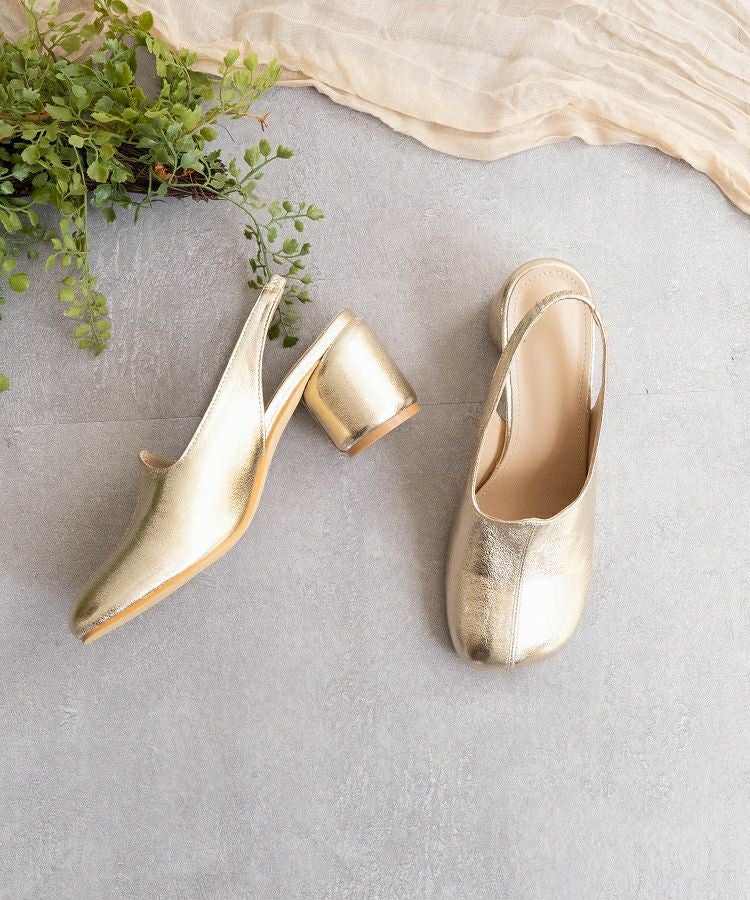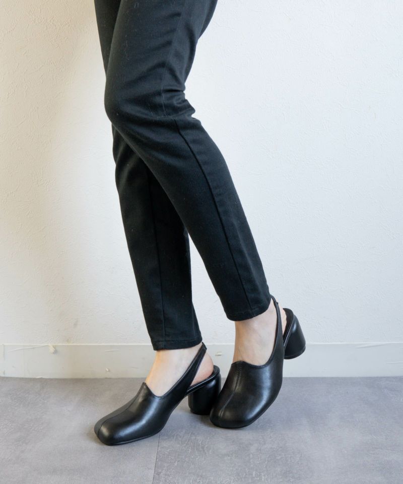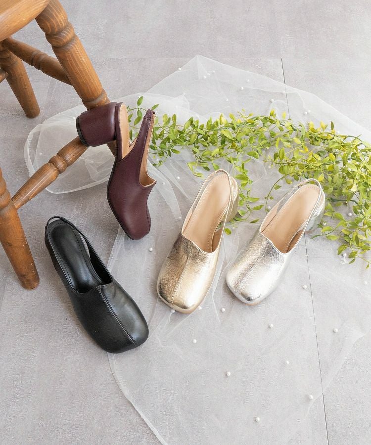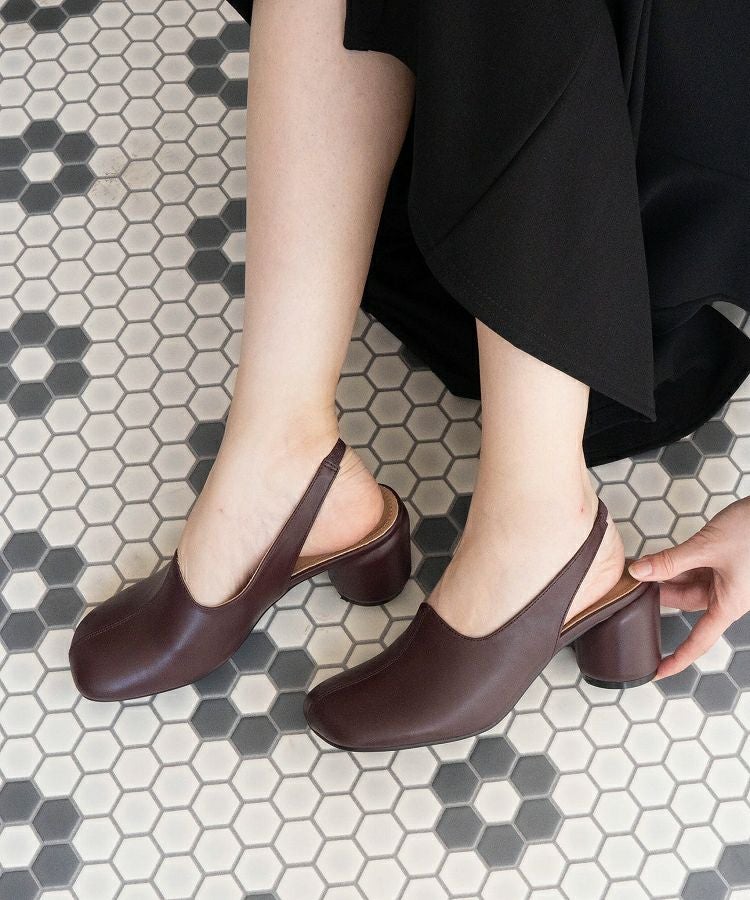 シンプルでありながら存在感のあるラウンドスクエアバックストラップパンプス。