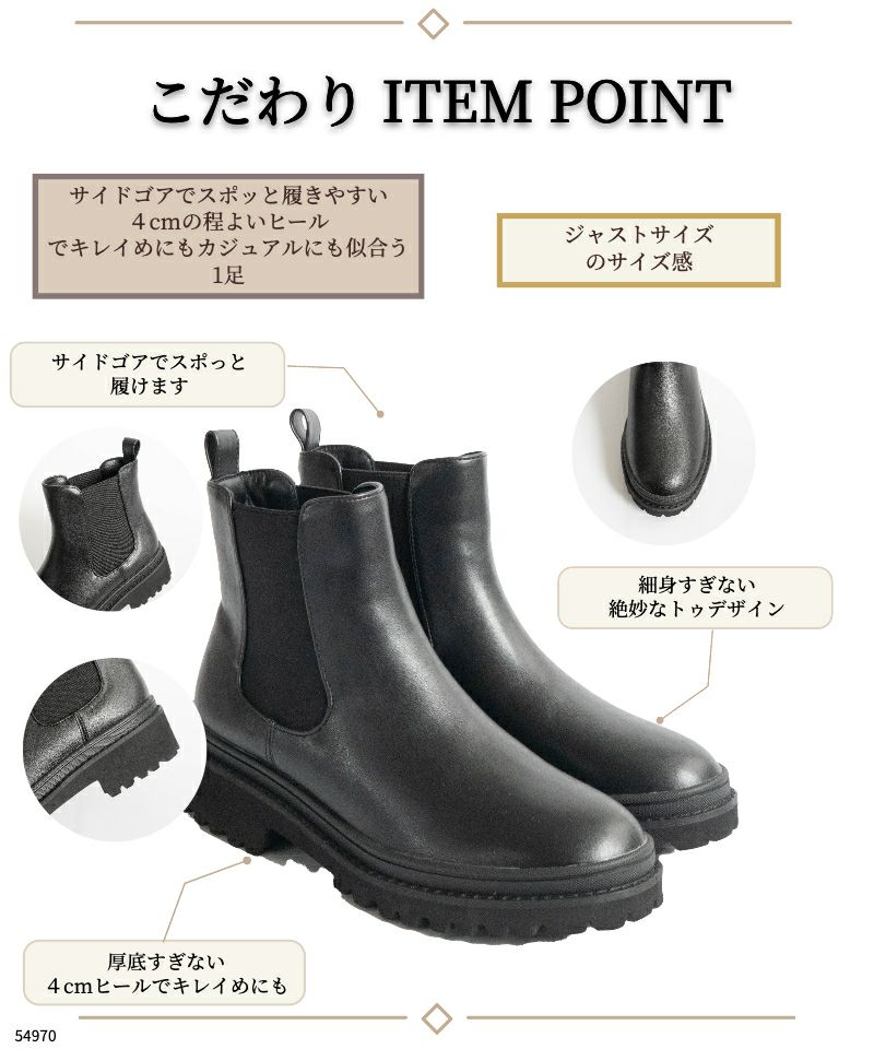 すっきりとしたシルエットが魅力の定番サイドゴアブーツ。