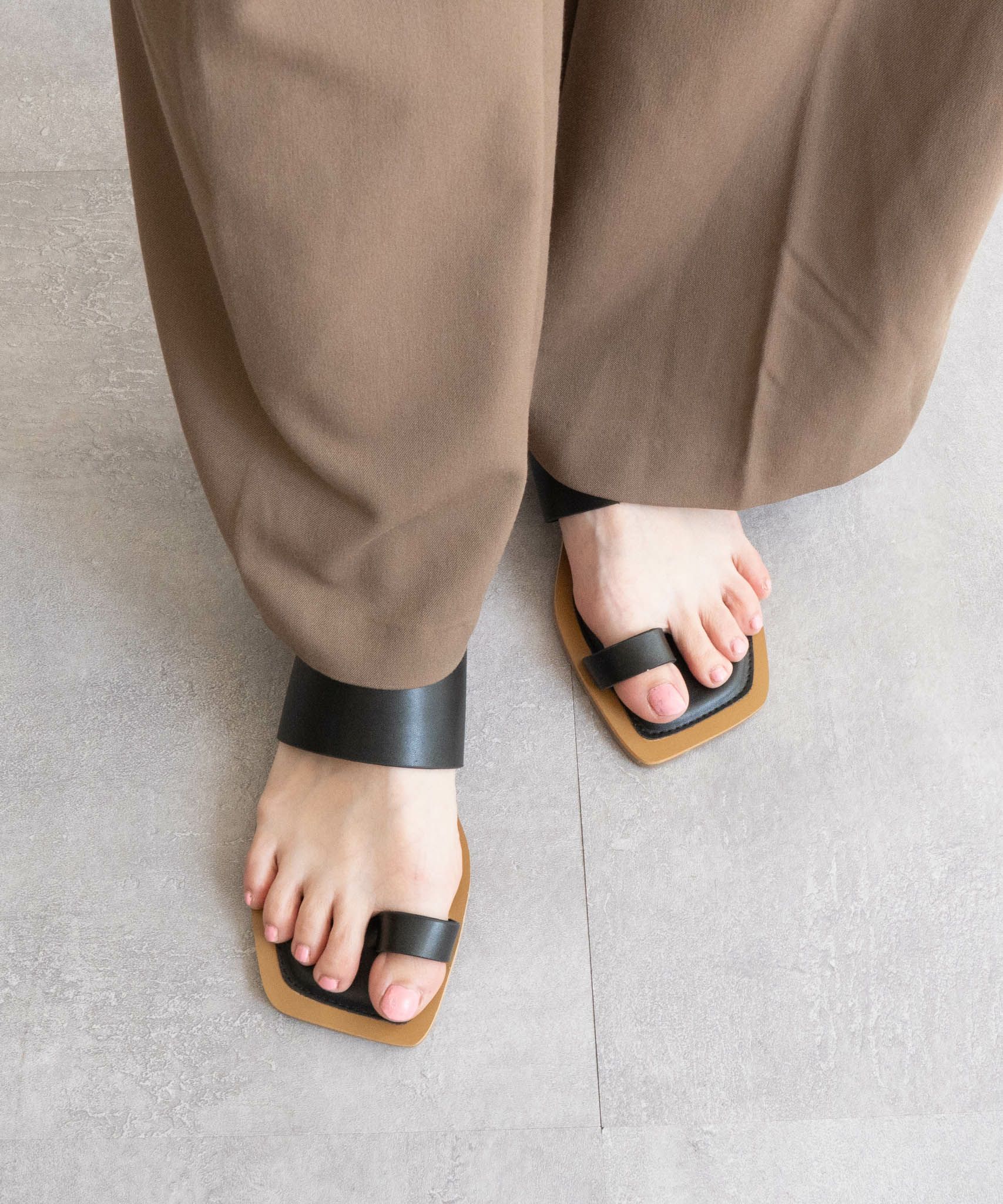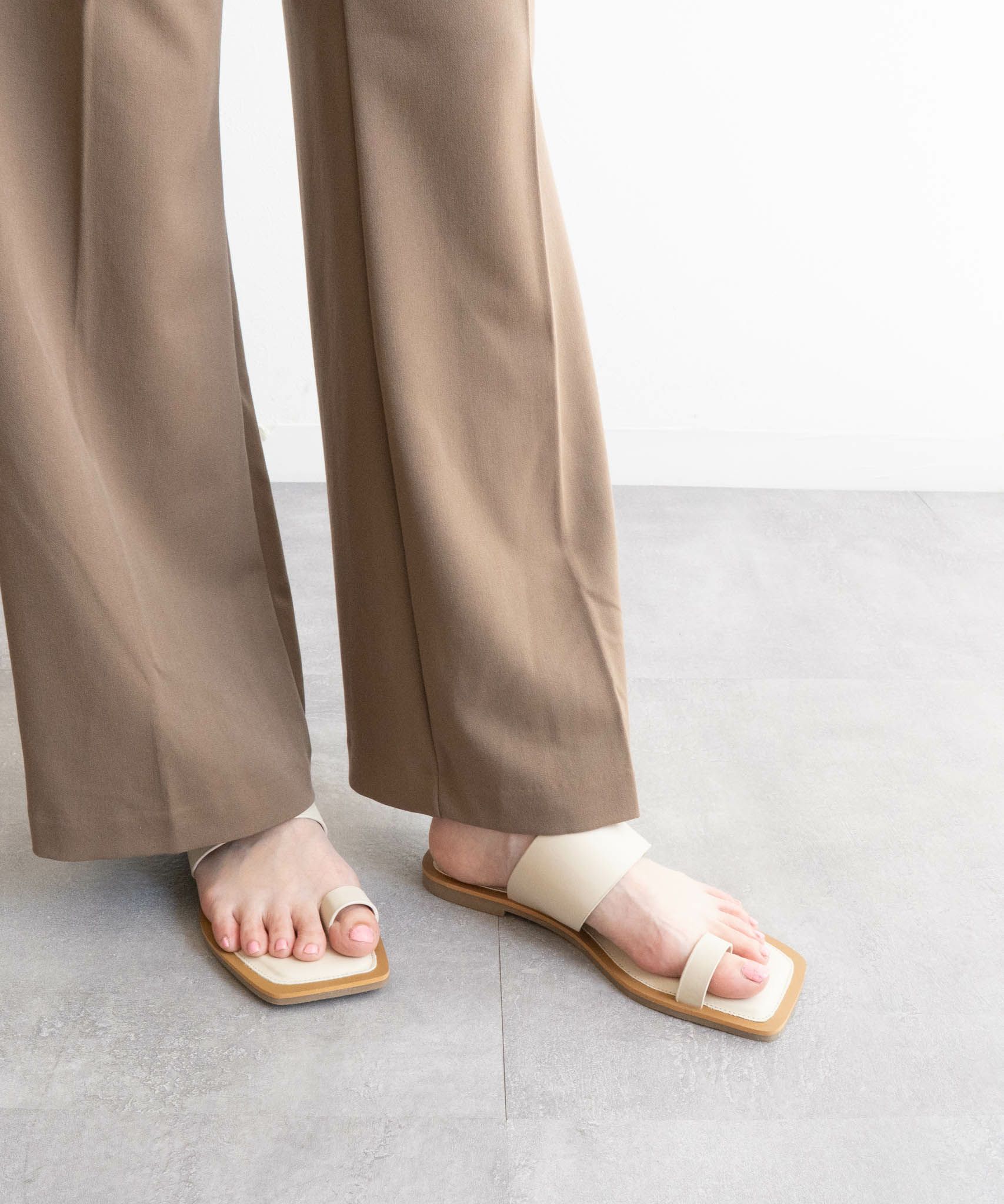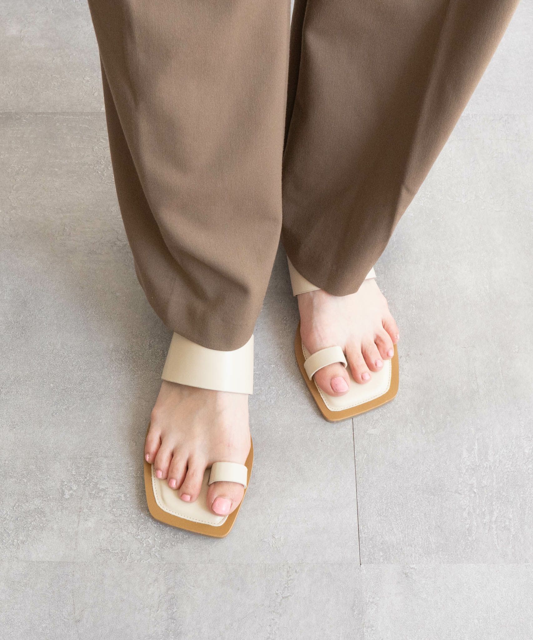 足元に抜け感をプラスしてくれる、バイカラーのトングフラットサンダル。