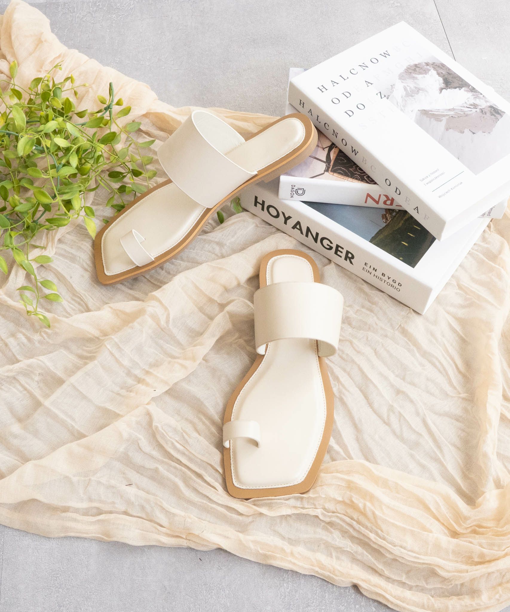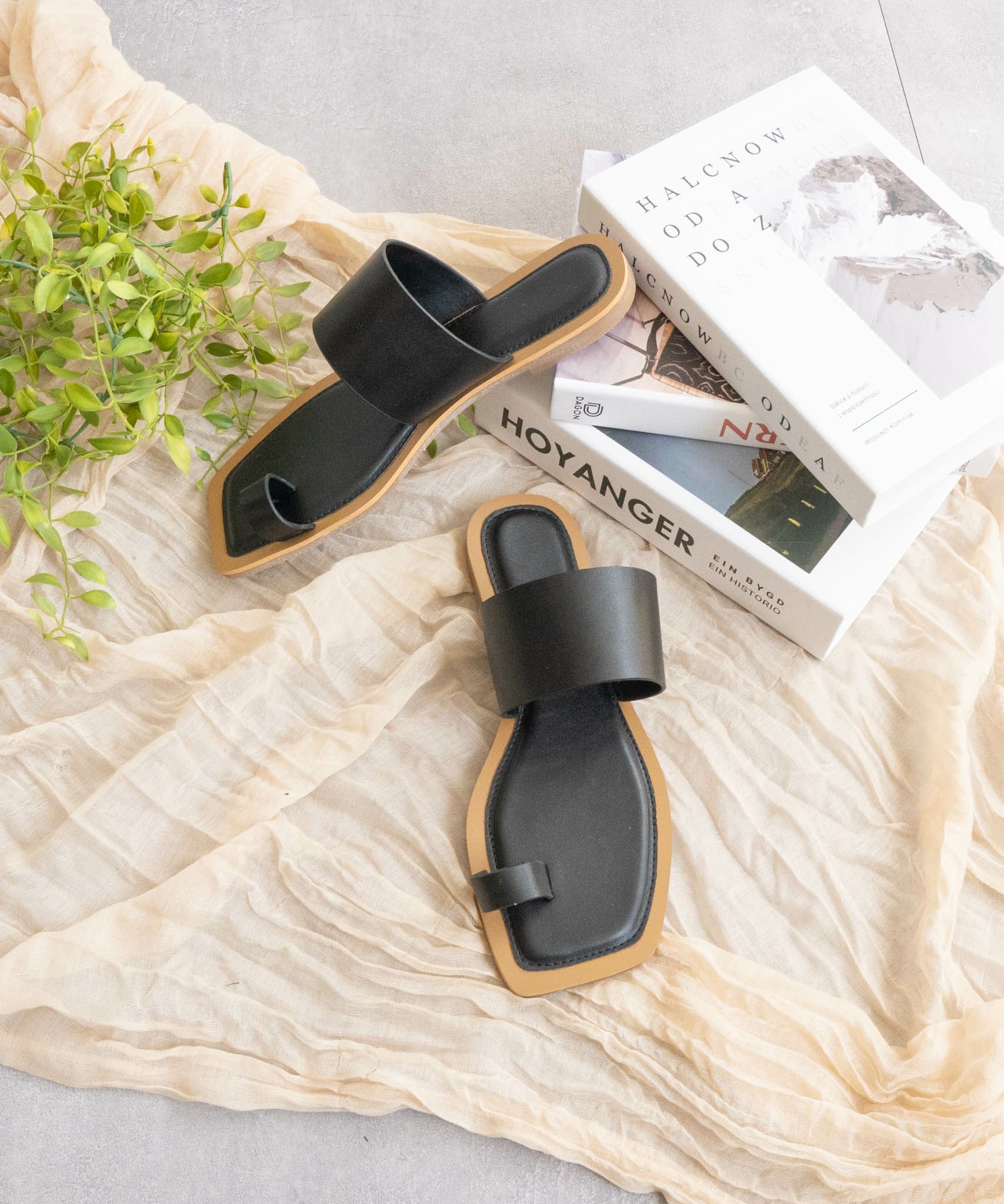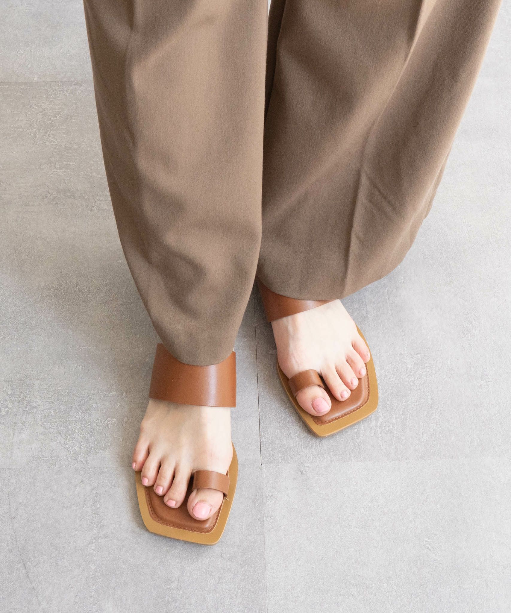 足元に抜け感をプラスしてくれる、バイカラーのトングフラットサンダル。