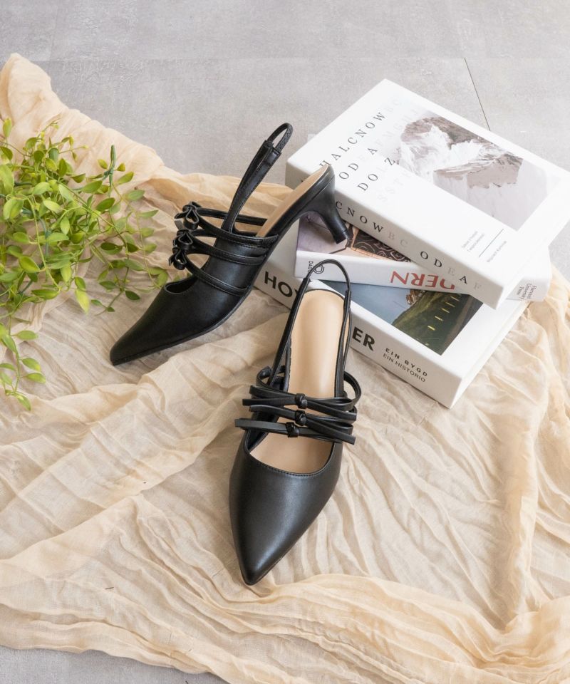 足元に可愛さと品をプラスしてくれる、3つ並んだ小さめリボンが主役のポインテッドサンダル。
