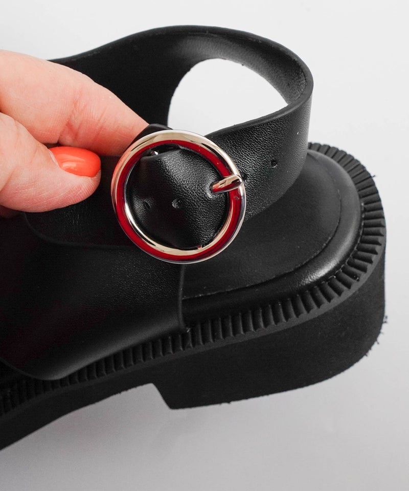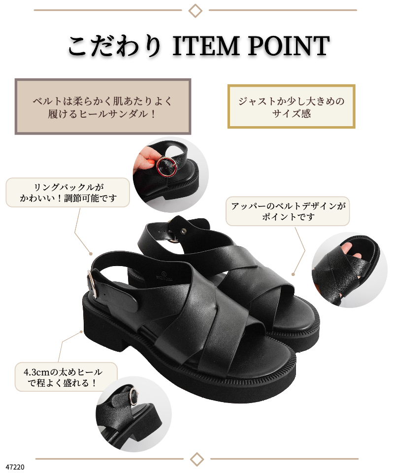 存在感のあるワイドなクロスストラップが、足をしっかりと包み込み、安定感のある履き心地を実現。
