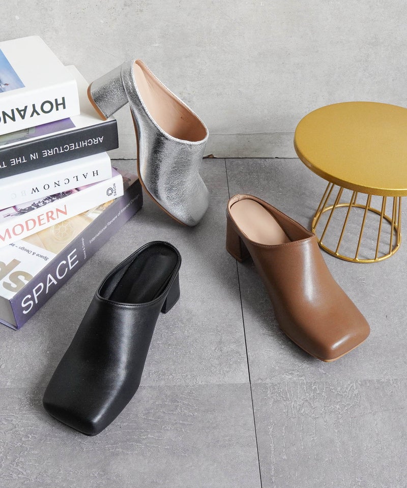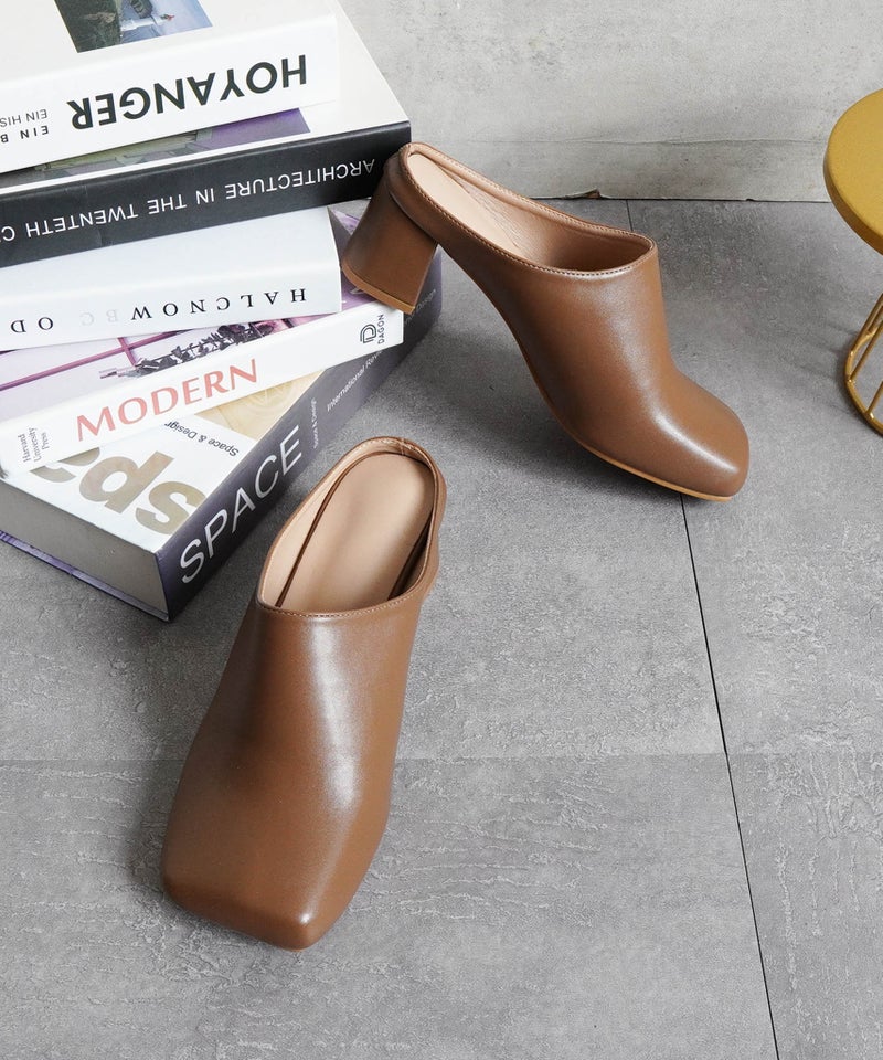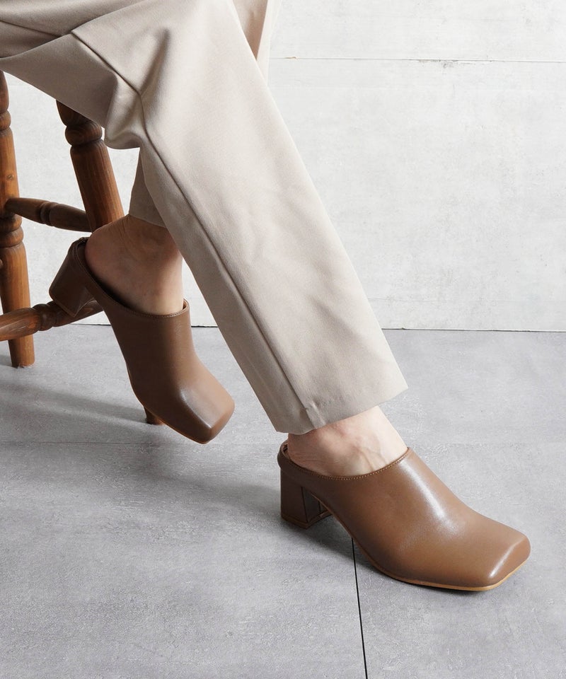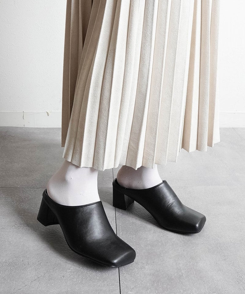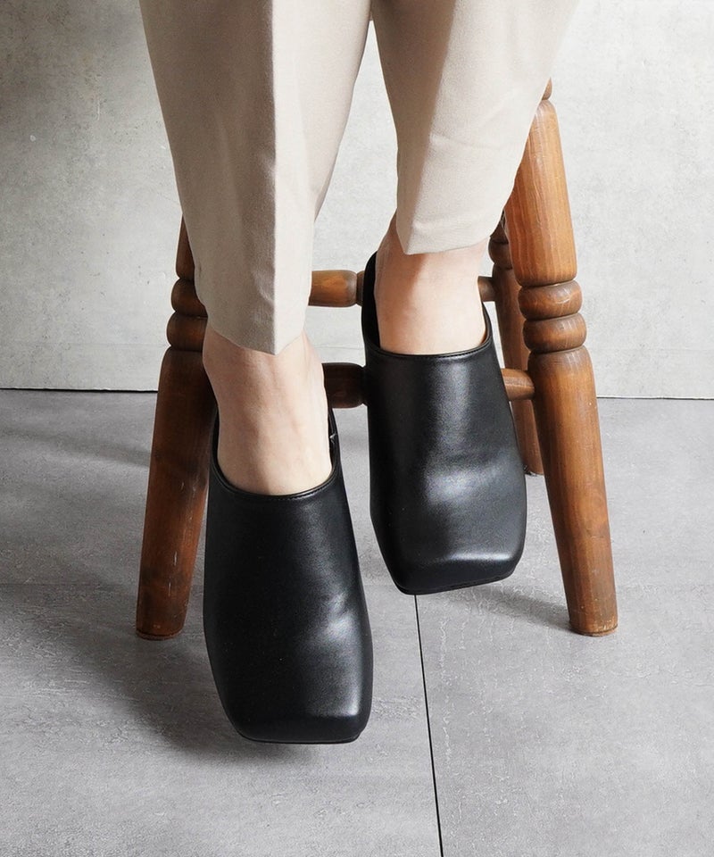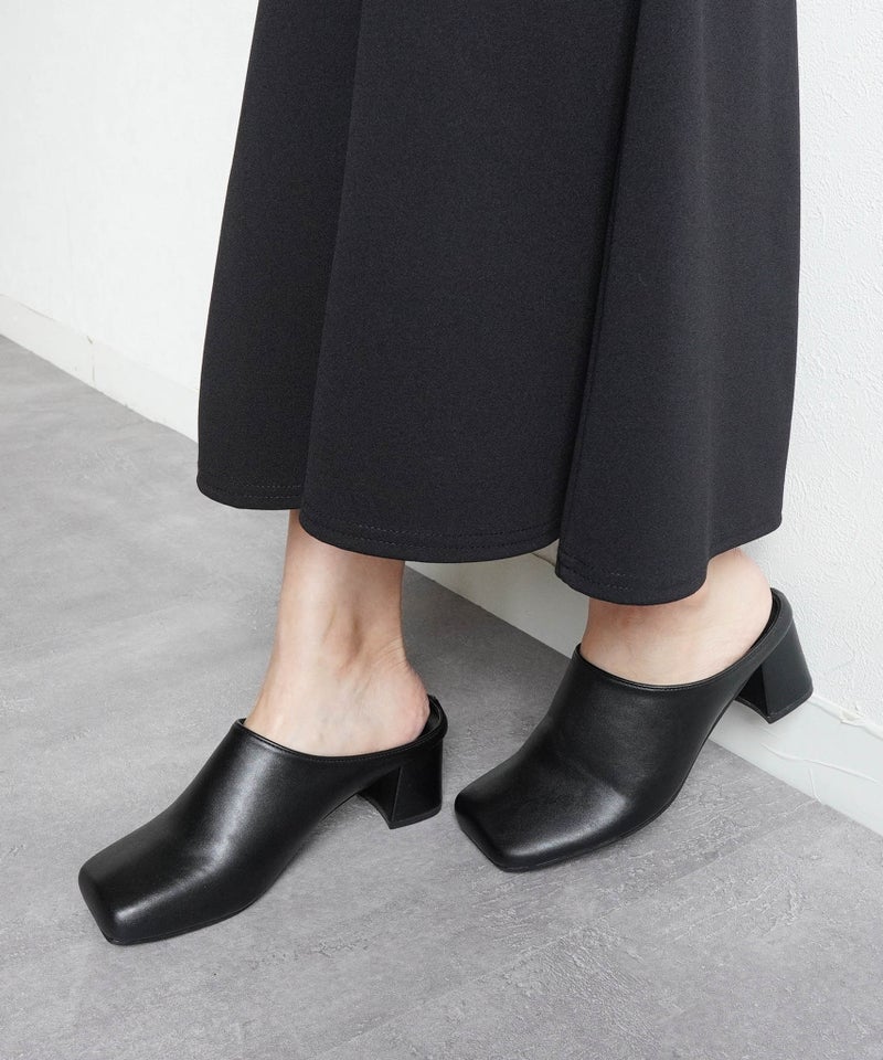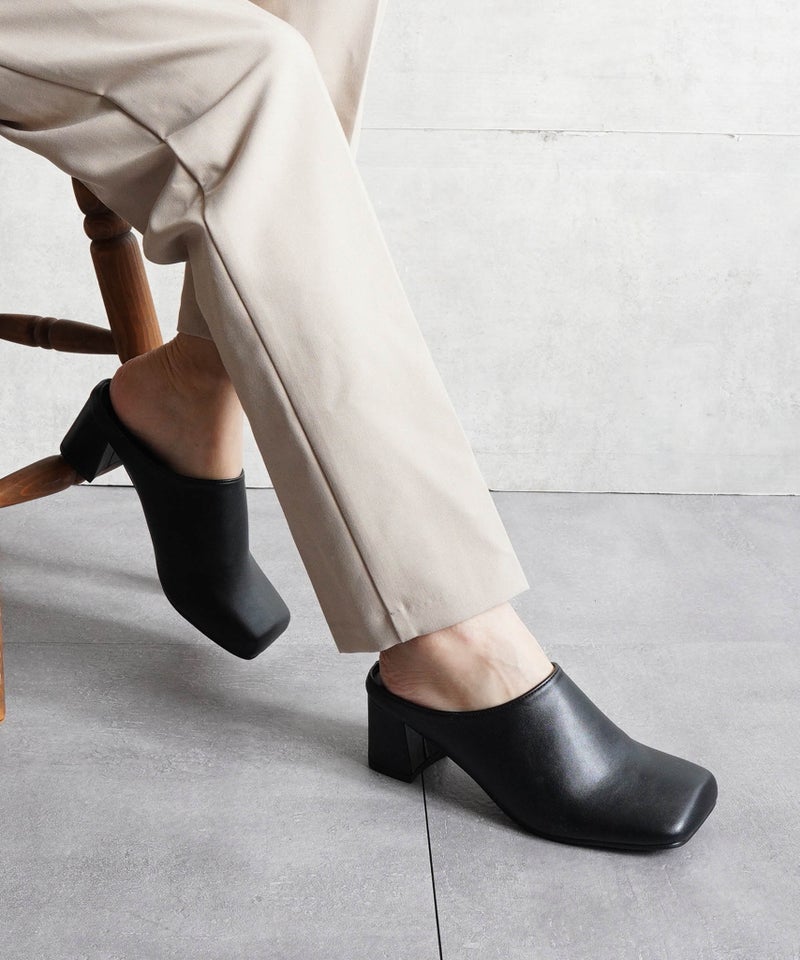 スクエアトゥが今っぽい、抜け感のあるチャンキーヒールミュール。
