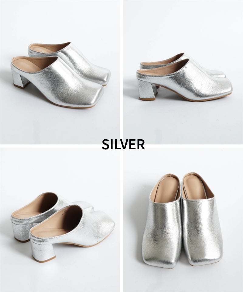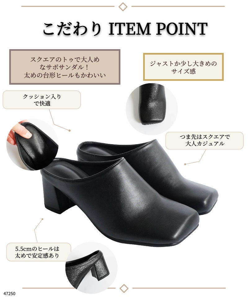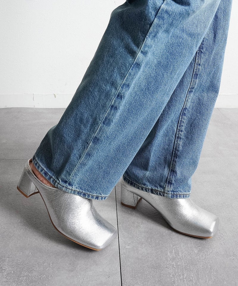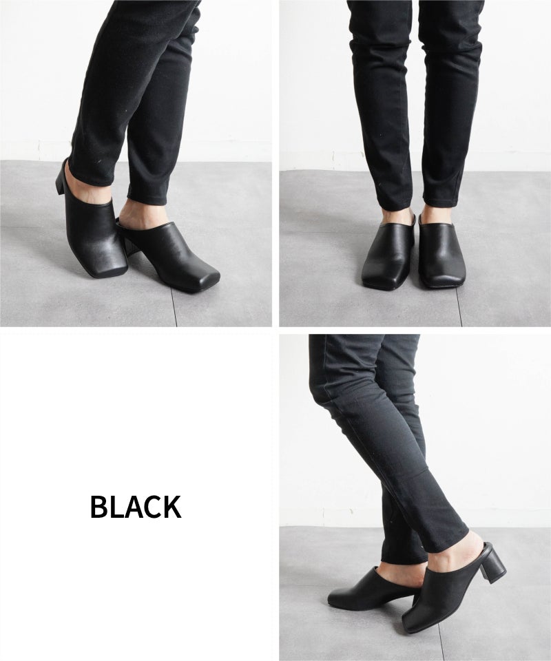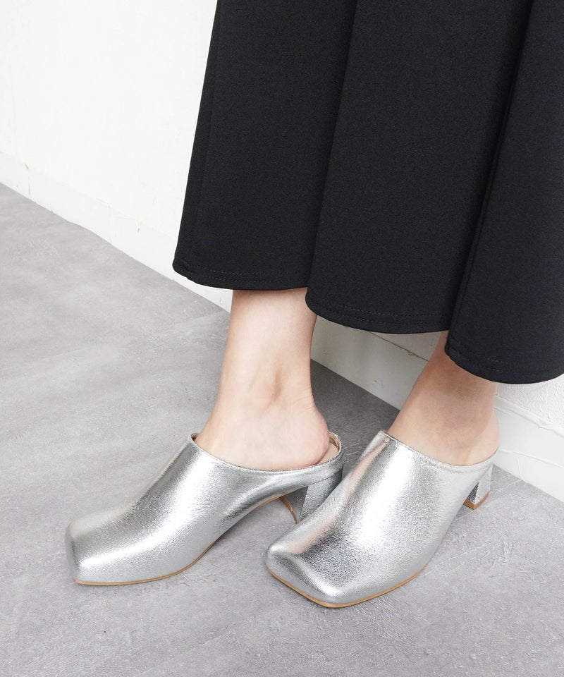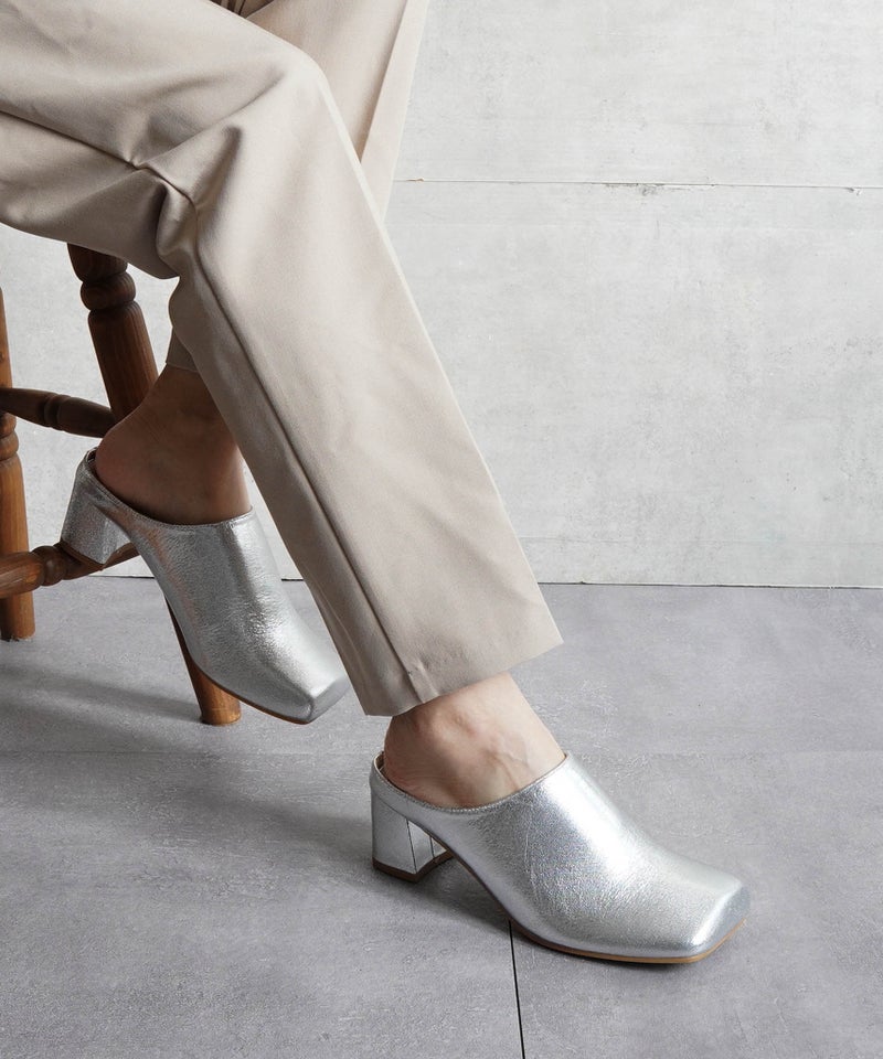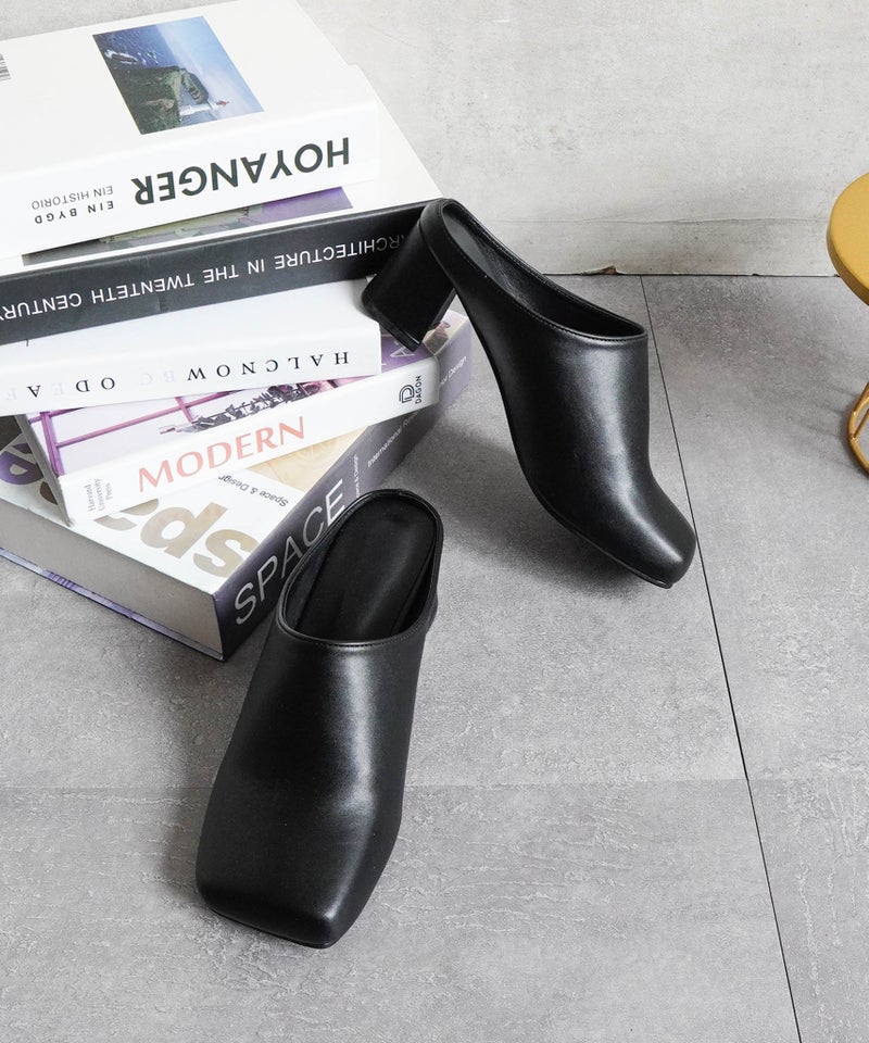 スクエアトゥが今っぽい、抜け感のあるチャンキーヒールミュール。