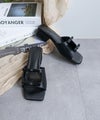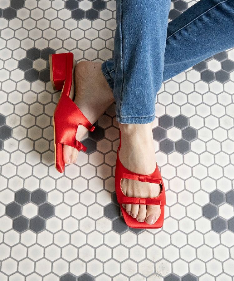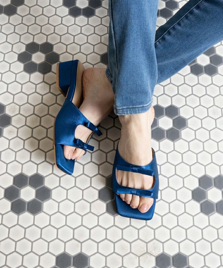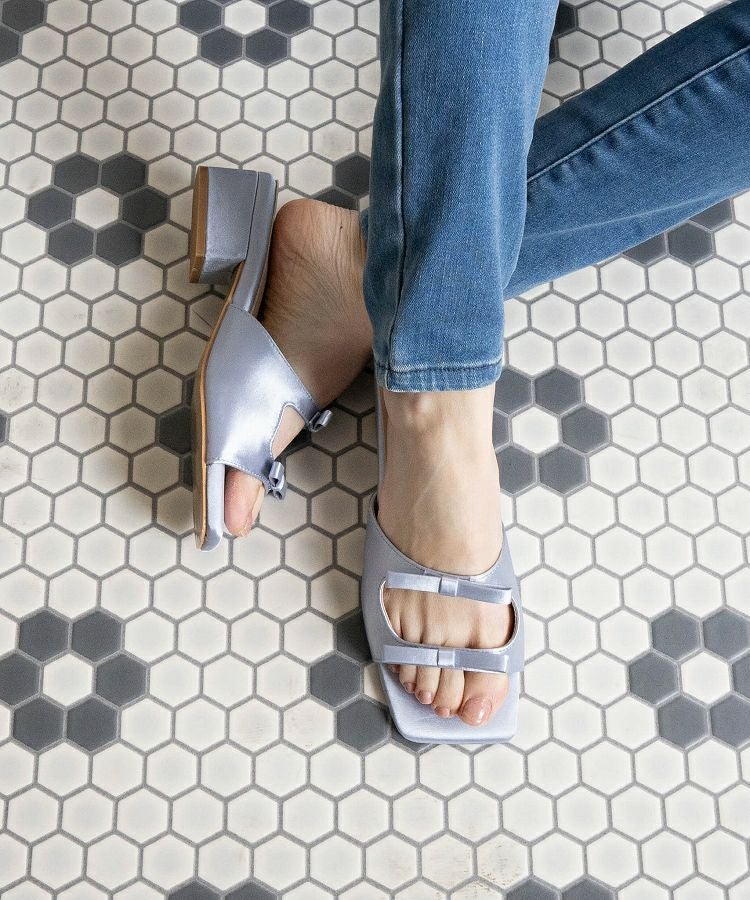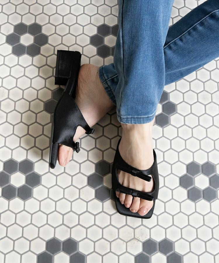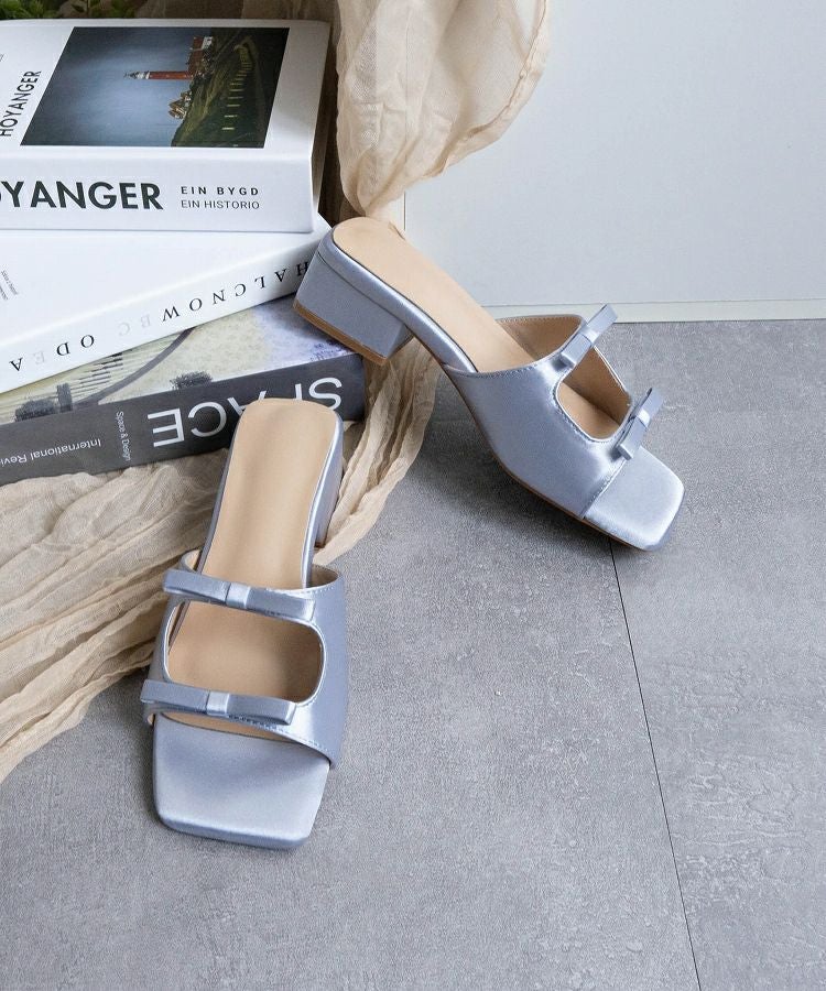 ダブルリボンとスクエアヒールが足元を華やかに演出するデザイン性の高いサンダルです。