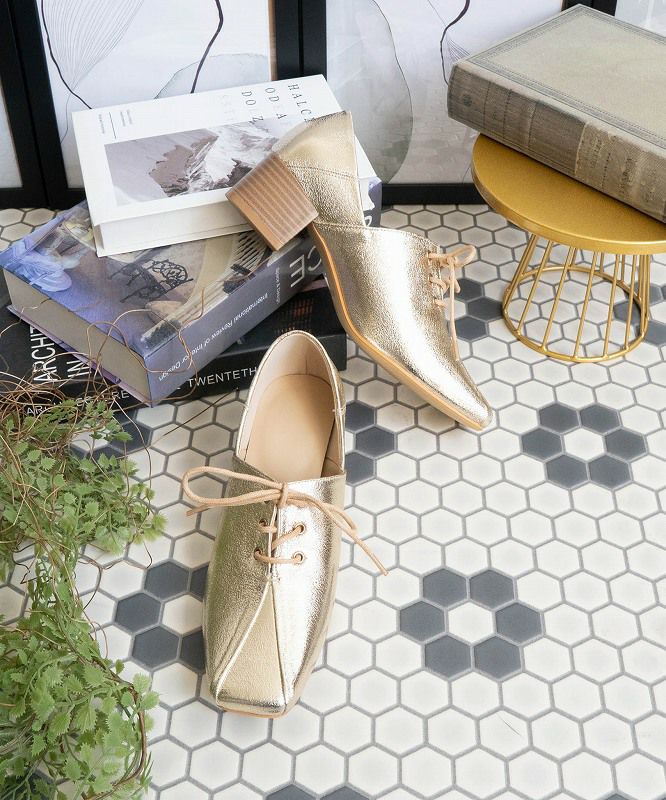 シャープなスクエアトゥが洗練された印象を与えるレースアップパンプス。