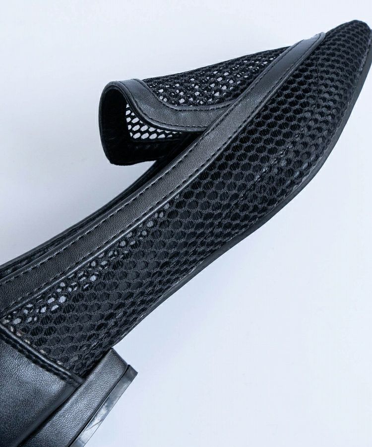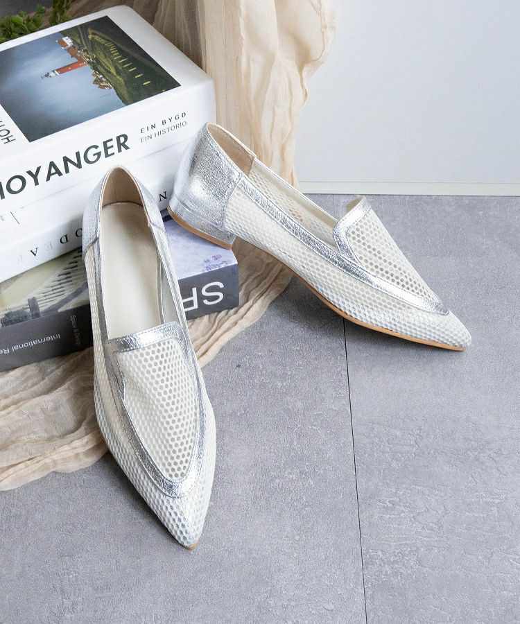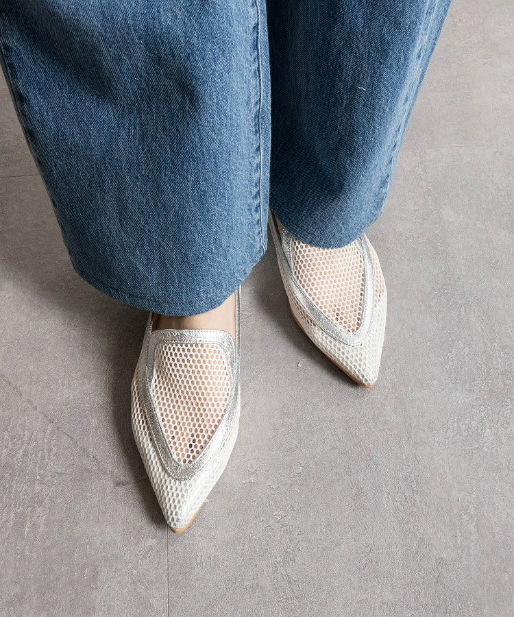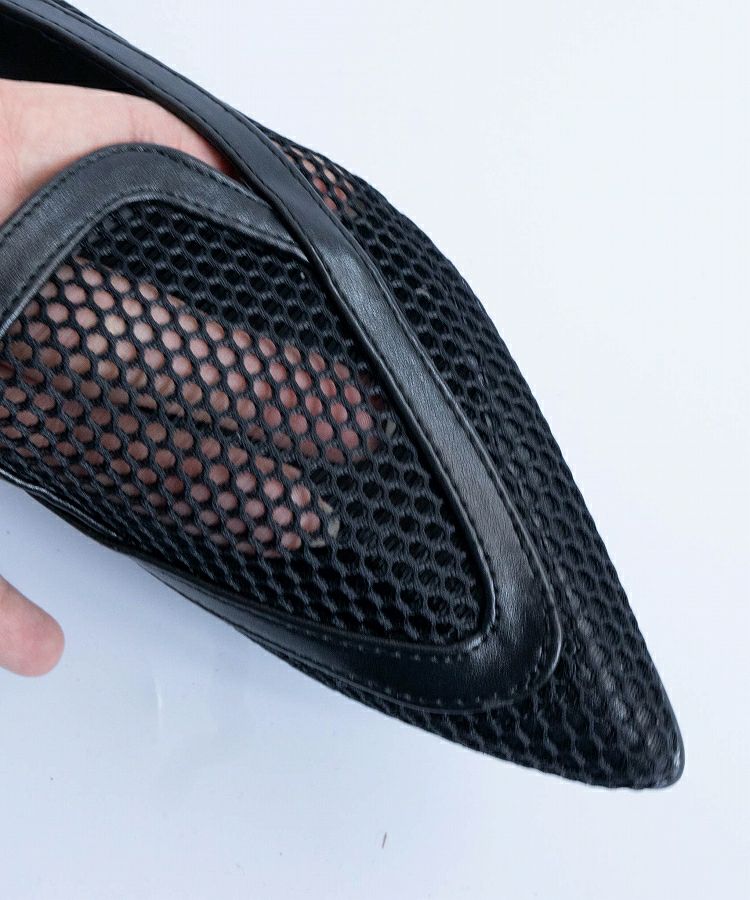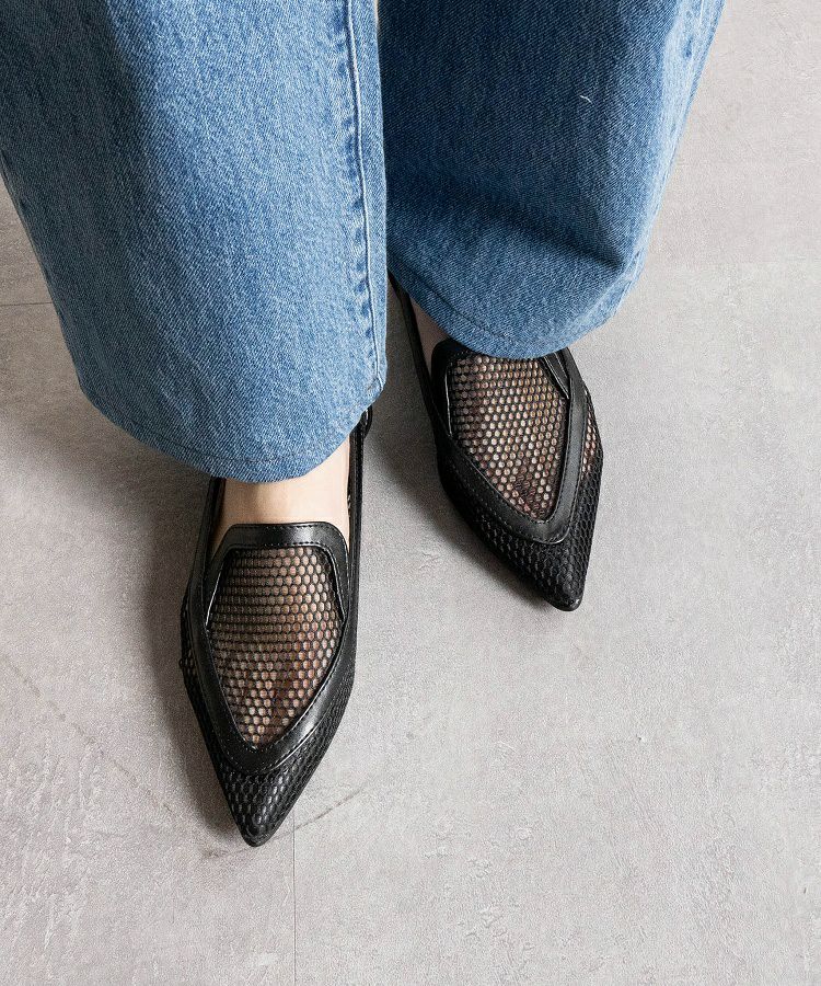 ポインテッドトゥのデザインとメッシュの透け感が、洗練された雰囲気を作り出し、特にオフィスやディナーなどのフォーマルなシーンにも最適です。