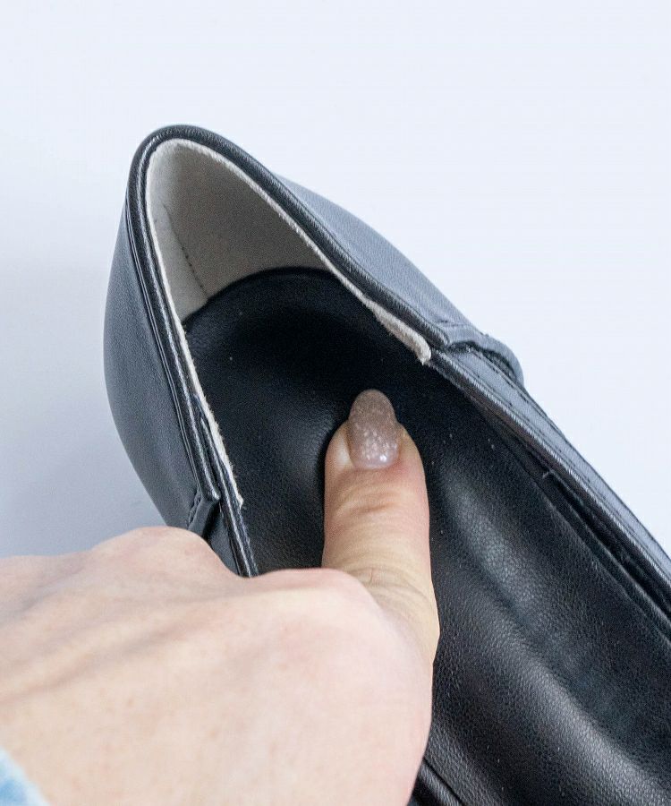 ポインテッドトゥのデザインにより、足元を細く美しく見せる効果があります。
