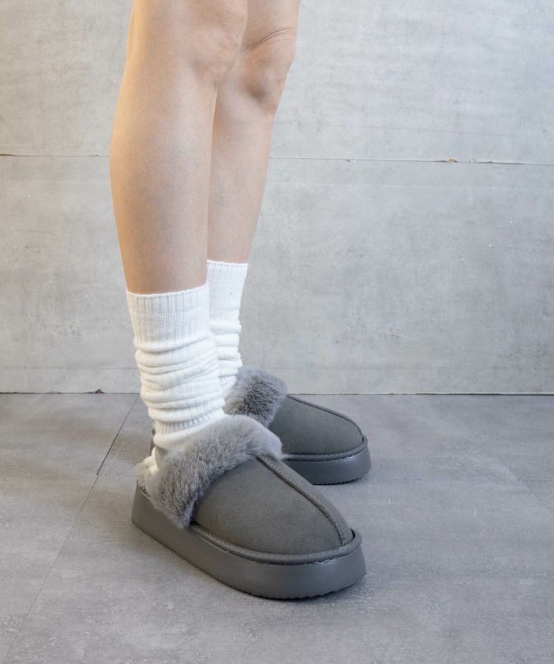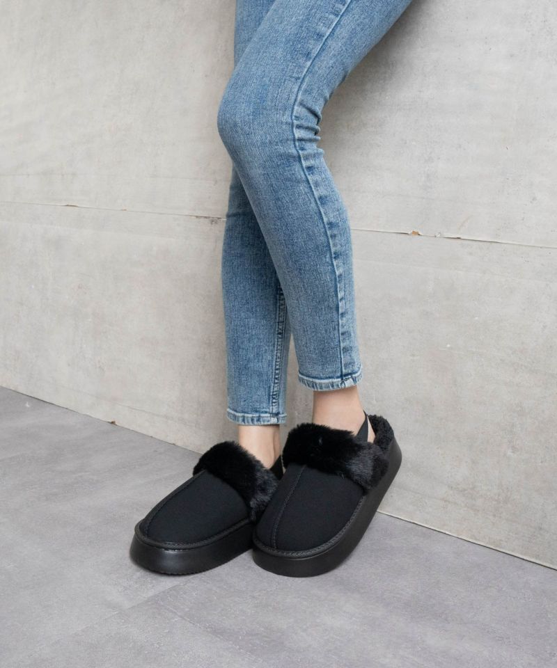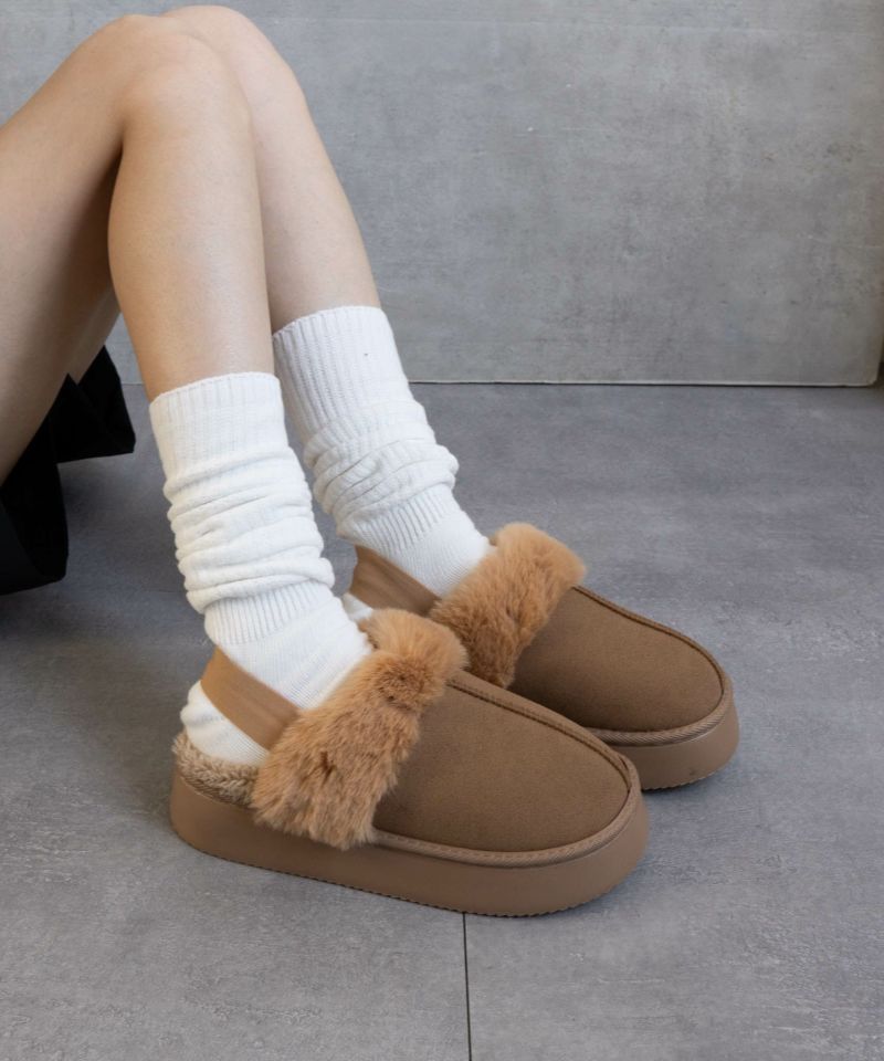 モコモコ素材による暖かさと柔らかさ、リングバックデザインによる安定感とスタイリッシュさを兼ね備えた一足です。