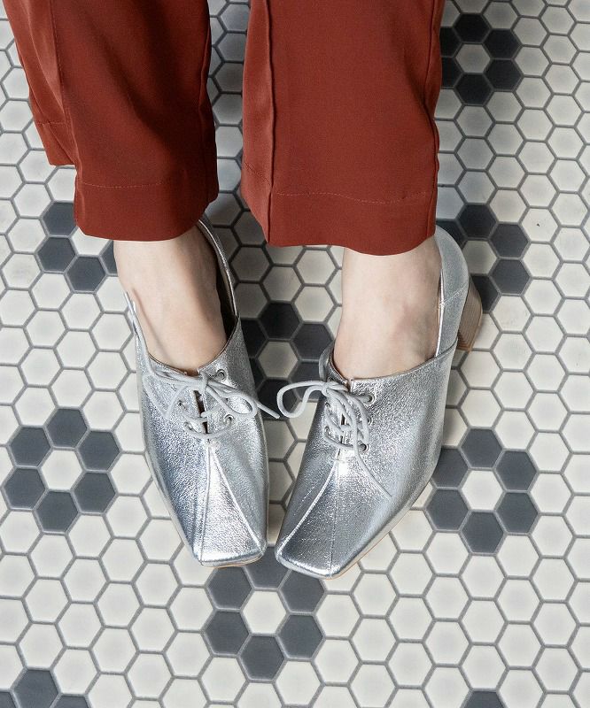 シャープなスクエアトゥが洗練された印象を与えるレースアップパンプス。
