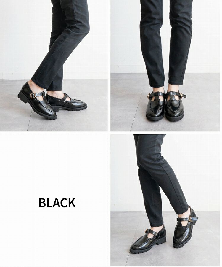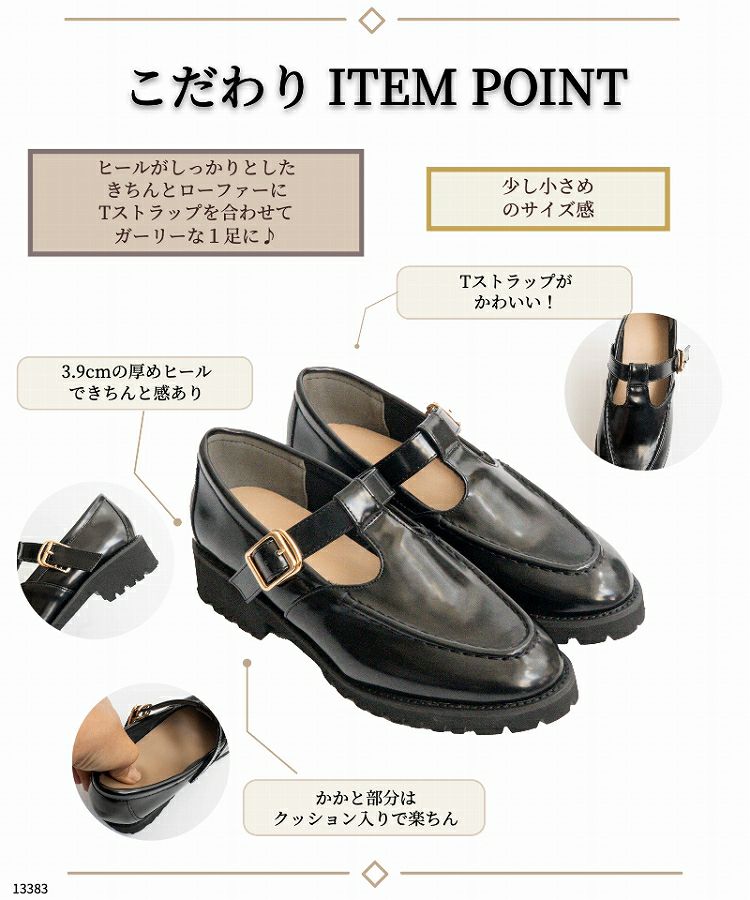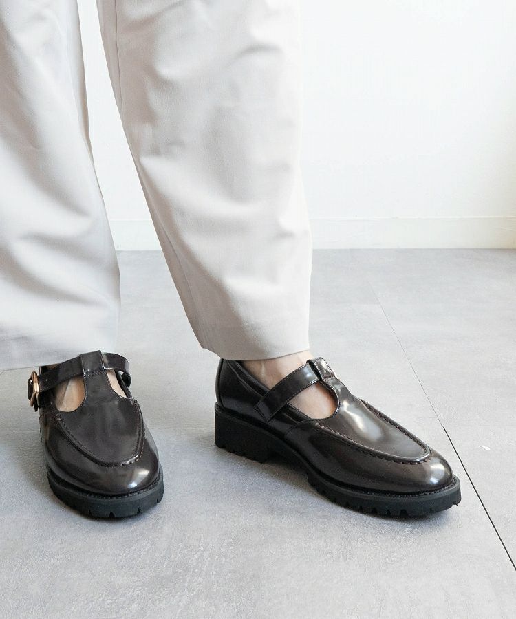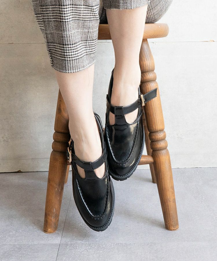 ローファーのきちんと感にTストラップを加えた、トラッドとフェミニンを両立する一足。