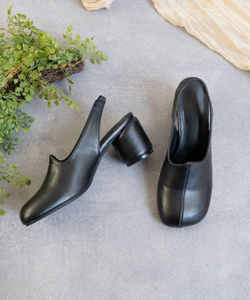 シンプルでありながら存在感のあるラウンドスクエアバックストラップパンプス。